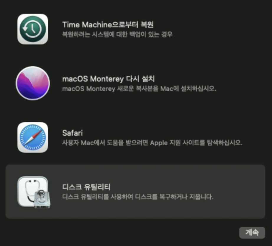 전원버튼 꾹눌러 종료후 다시 전원 버튼 눌러서 시작 하자마자 command + option + R 누르고 있기