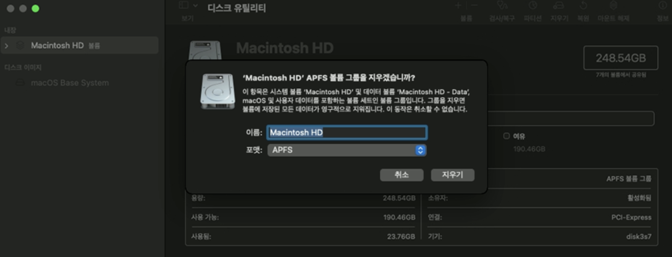 - 디스크 유틸리티, 기존 데이터를 지우기