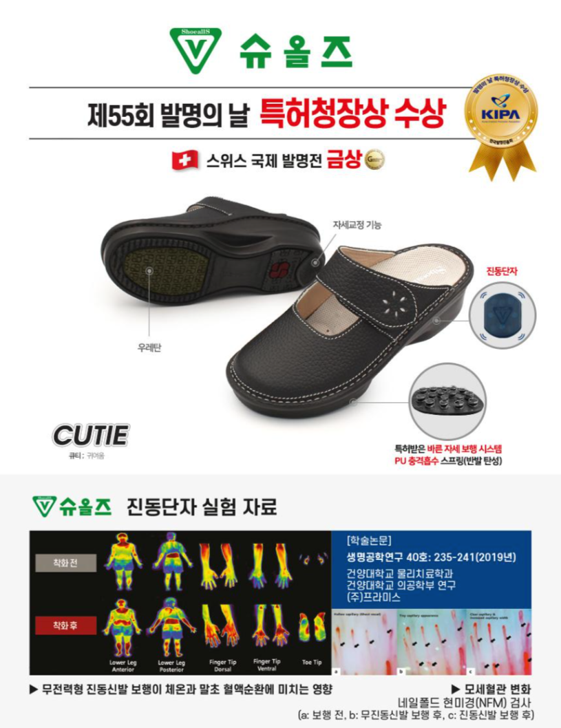 슈올즈 브랜드는 55회 발명의날 특허청장상을 수상했고 스위스 국제 발명전에서 금상을 수상할 정도로 유명한 신발이다.
