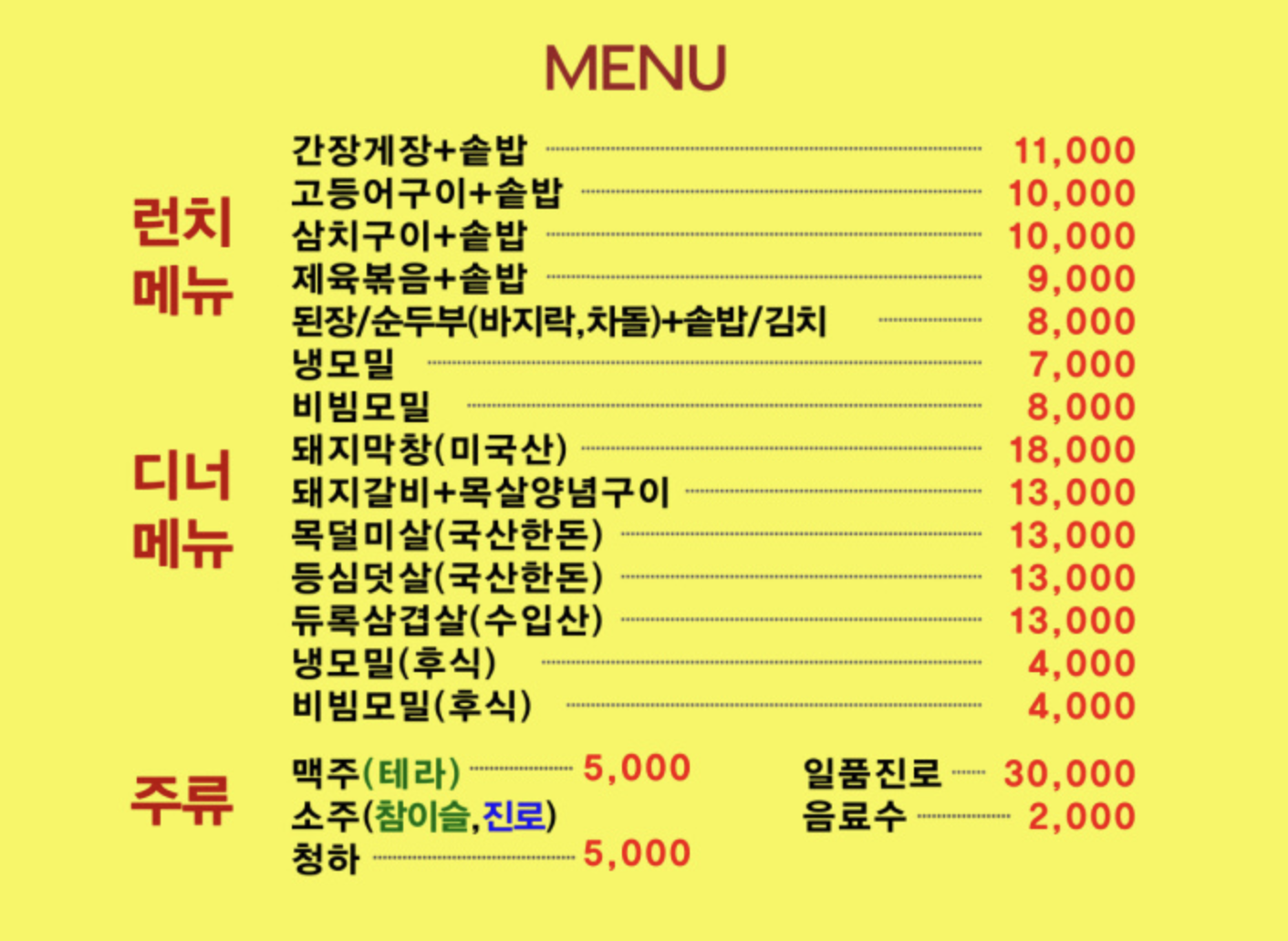 메뉴 및 가격