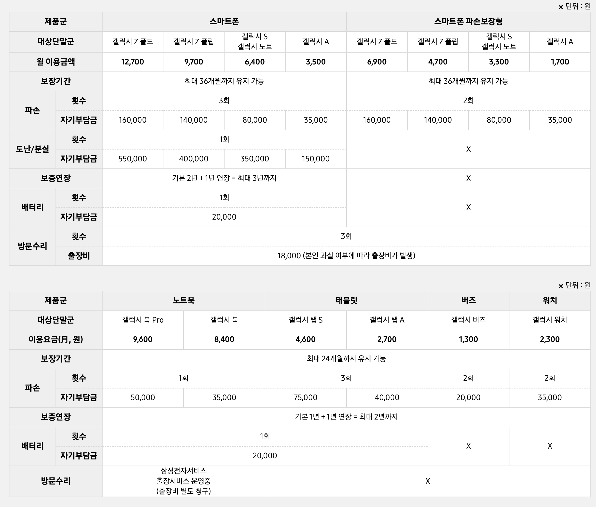 * 삼성케어플러스 월정액 요금은 사전 통지 없이 변경될 수 있습니다. (가입 시점에 따라 월정액 요금이 달라질 수 있습니다.)