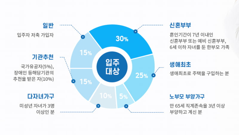 - (우선공급) 물량의 70%를 소득 100% 이하인 자에게 추첨의 방법으로 입주자 선정하여 우선 공급