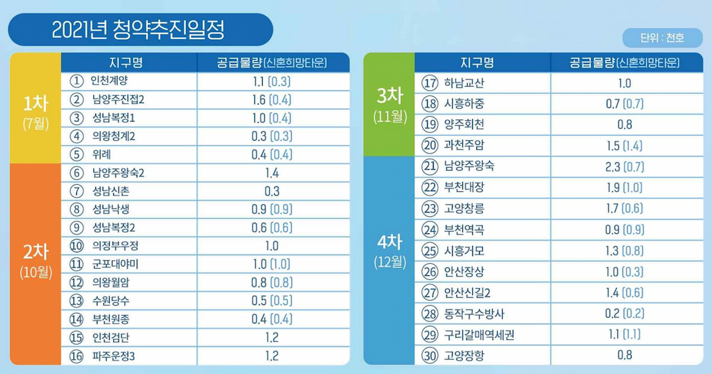 - 7월에는 3기 신도시인 인천계양지구에서 1.1천호가 공급되며, 위례신도시 4백호, 성남복정지구 1천호 등도 계획되어 있다.