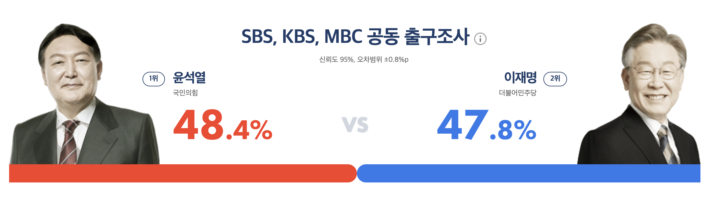 출구조사떄 48.4% 였는데 실제 개표 결과 48.6%로 당선이 되었다.